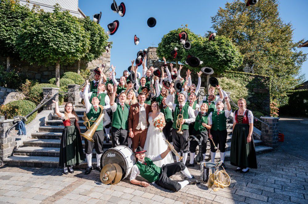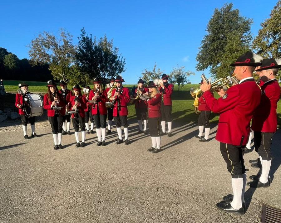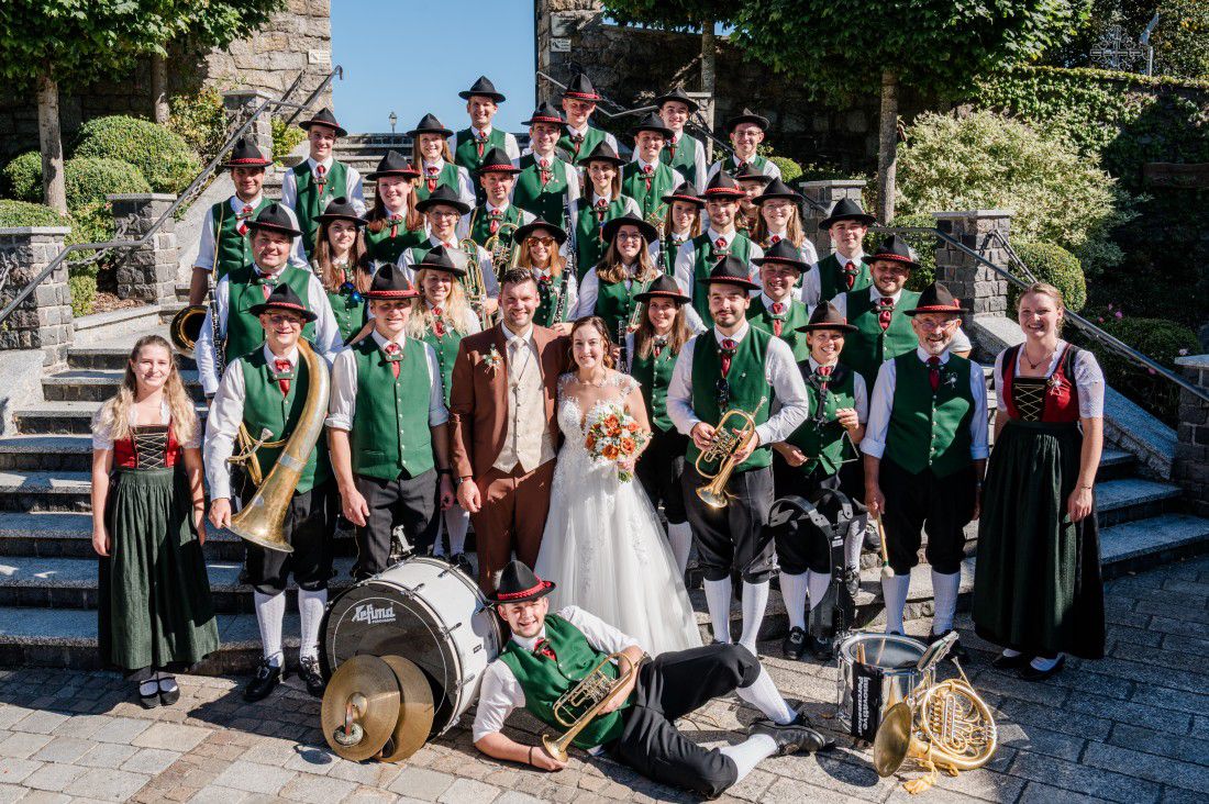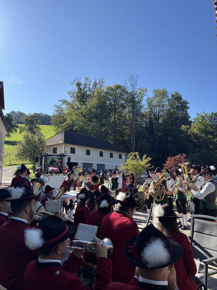 Wie es sich für eine traditionelle Musik-Hochzeit gehört, teilten wir uns am 20. September 2025 in zwei Gruppen auf um Eva und Philipp bei ihren Elternhäusern zu begrüßen. Als Philipp seine Braut mit einem Traktor abholte, fusionierten wir wieder zu einer Gruppe. Nach einer musikalisch umrahmten Trauung in der Kirche von St. Leonhard am Walde ging es zum Schliefauhof. Als Tanzlmusi und auch beim Brautstehlen waren wir im Einsatz und verbrachten einen wunderschönen Tag. Wir wünschen den beiden für ihre Zukunft alles Gute!