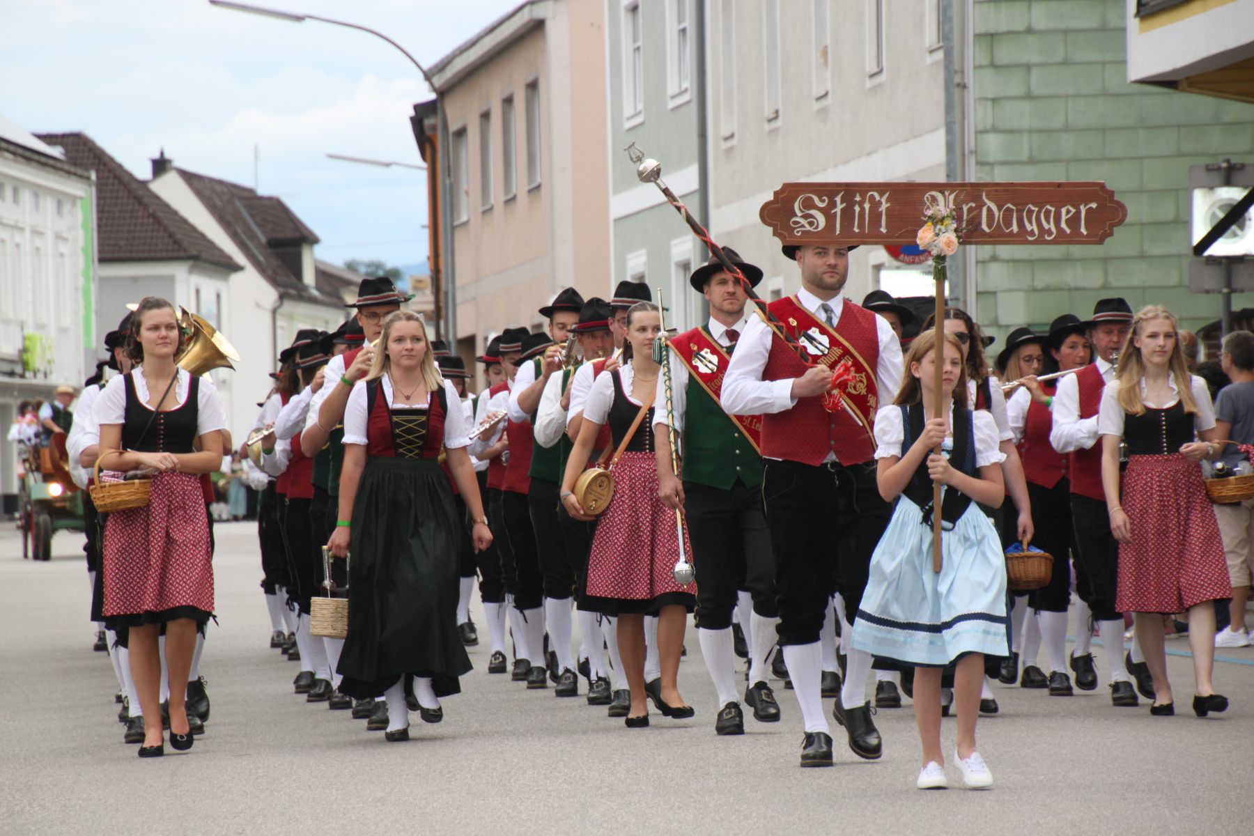 Leider waren wir krankheitsbedingt am Schlagzeug nur knapp besetzt und zu allem Überfluss fiel vor Ort ein weiterer Schlagzeuger aufgrund von Übelkeit aus. Aber was wäre Musik, wenn man sich nicht gegenseitig helfen würde: Nach kurzer Absprache beschlossen die Musikkapelle Stift Ardagger und wir miteinander am Festumzug teilzunehmen. Nach dem Festakt und dem Gesamtspiel wurde der Abend im Festzelt gemütlich ausgeklungen.